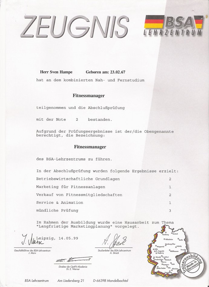 Jeder einzelne Schwerpunkt meiner Ausbildung wurde durch die Berufsschulakademie (BSA), in Zusammenarbeit mit der Sportuniversität sowie mit der Industrie- und Handelskammer (IHK) in Leipzig geprüft und wie folgt bewertet: